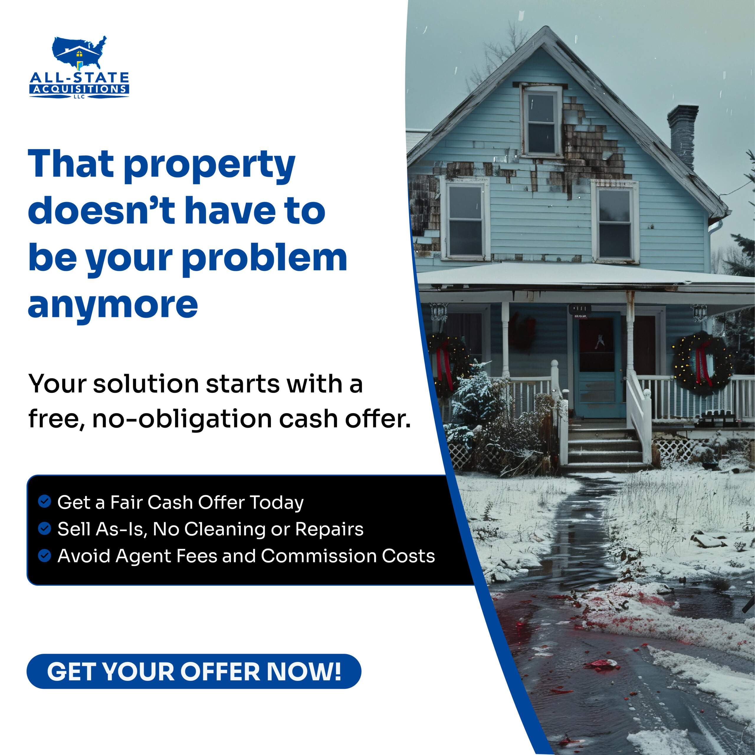 ALL-STATE ACQUISITIONS LLC is a local, family-owned real estate investment company. We offer several advantages to homeowners who want to sell their property fast v/s going a traditional route of listing with a real estate agent. We help homeowners and property owners sell houses and land quickly, easily, and for cash. We buy properties in as-is condition and can often make fair, market-based offers sight unseen. Once we reach an agreement , we may have a local professional visit to take photos and confirm details.